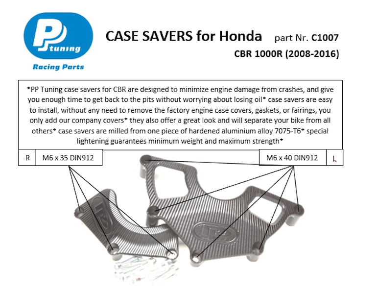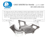 Set protektorů pro Honda CBR1000RR, které chrání motor při pádu a ušetří nemalé prostředky v případě i menší havárie. Ceny originálních dílů jsou vysoké a dojde-li k poškození víka, pod kterým je elektronika, jsou škody na Vašem motocyklu opravdu veliké. Kromě toho se Váš motocykl bude prostě odlišovat díky originálnímu vzhledu.