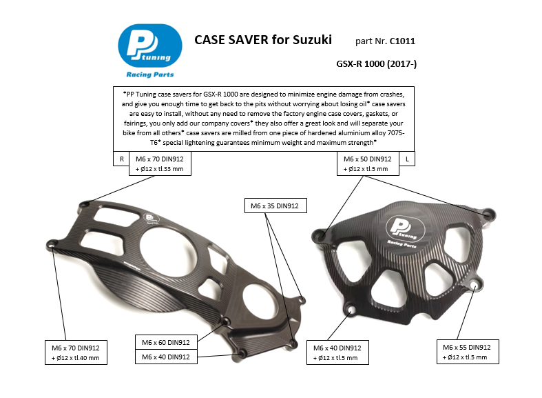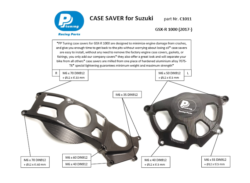 Set protektorů pro Suzuki GSX-R1000 (2017 - ), které chrání motor při pádu a ušetří nemalé prostředky v případě i menší havárie. Ceny originálních dílů jsou vysoké a dojde-li k poškození víka, pod kterým je elektronika, jsou škody na Vašem motocyklu opravdu veliké. Kromě toho se Váš motocykl bude prostě odlišovat díky originálnímu vzhledu.