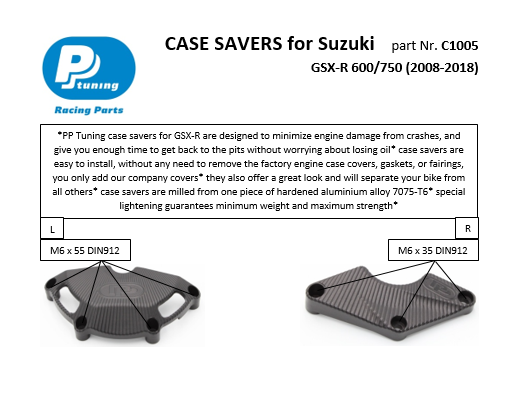 Set protektorů pro Suzuki GSX-R600/750, které chrání motor při pádu a ušetří nemalé prostředky v případě i menší havárie. Ceny originálních dílů jsou vysoké a dojde-li k poškození víka, pod kterým je elektronika, jsou škody na Vašem motocyklu opravdu veliké. Kromě toho se Váš motocykl bude prostě odlišovat díky originálnímu vzhledu.