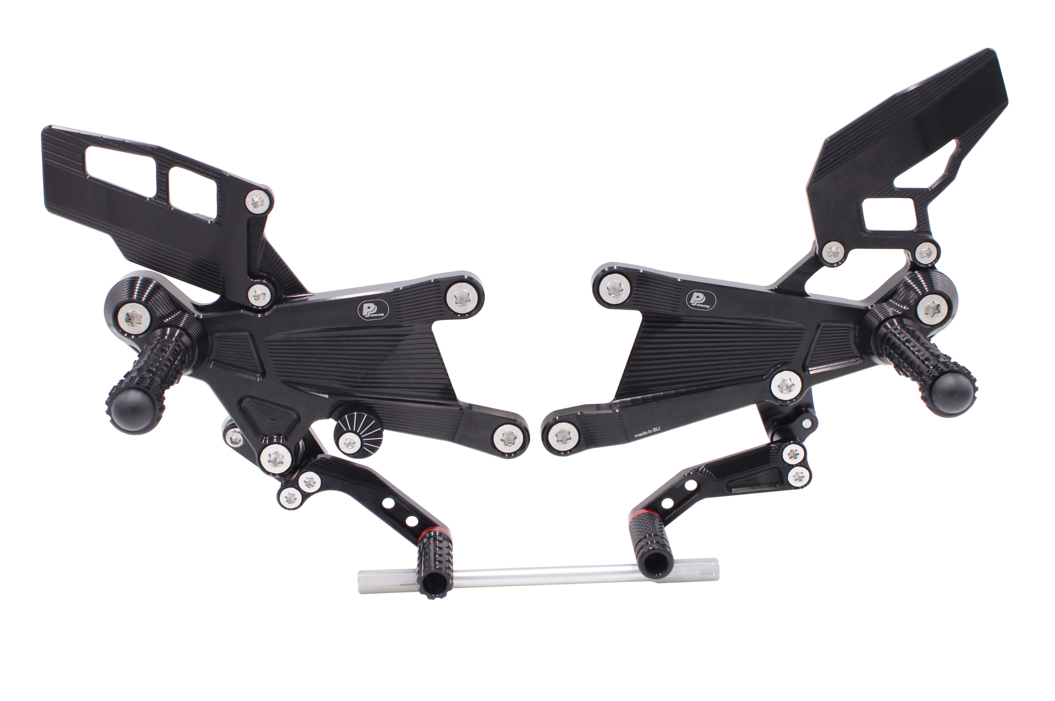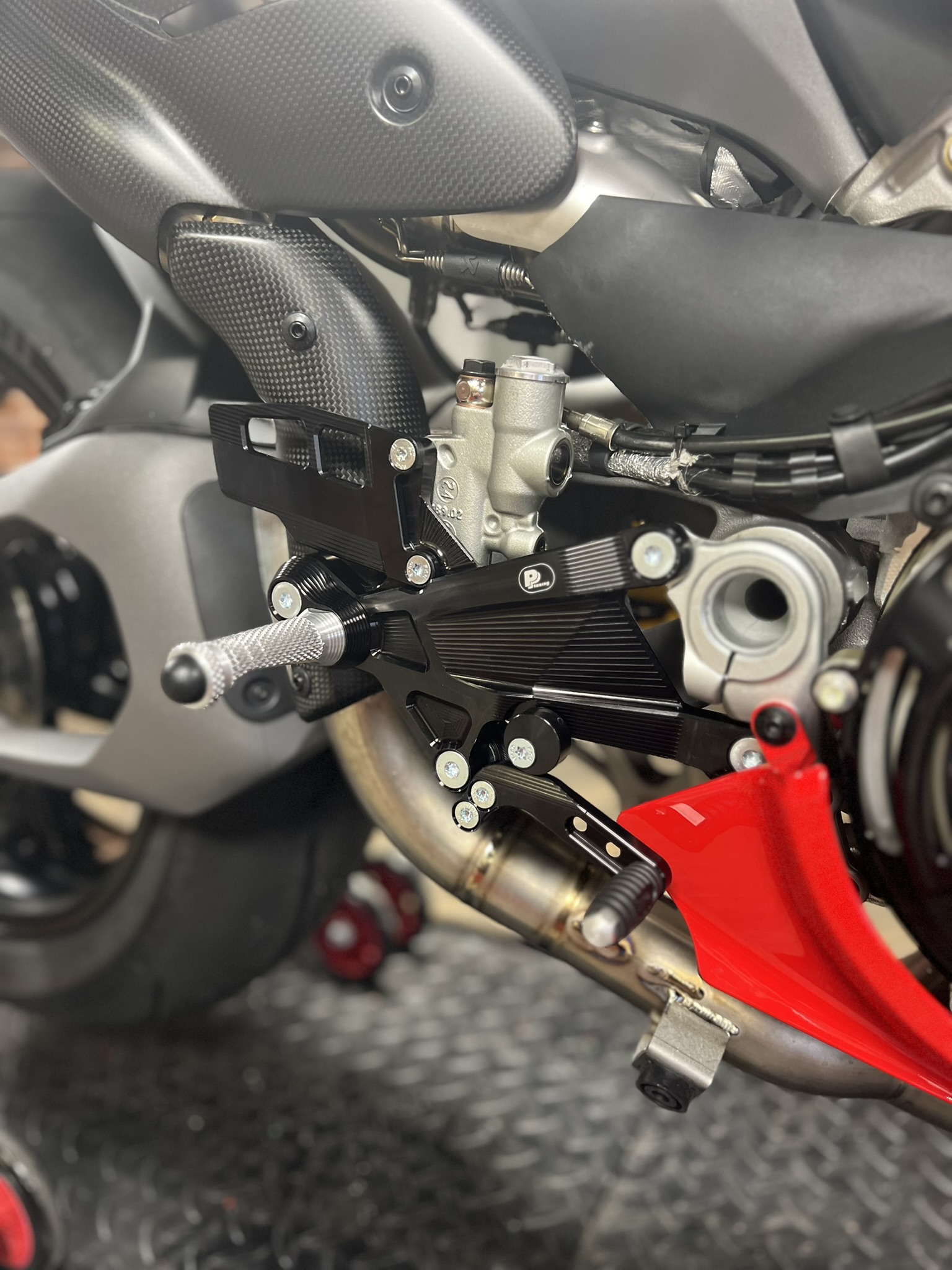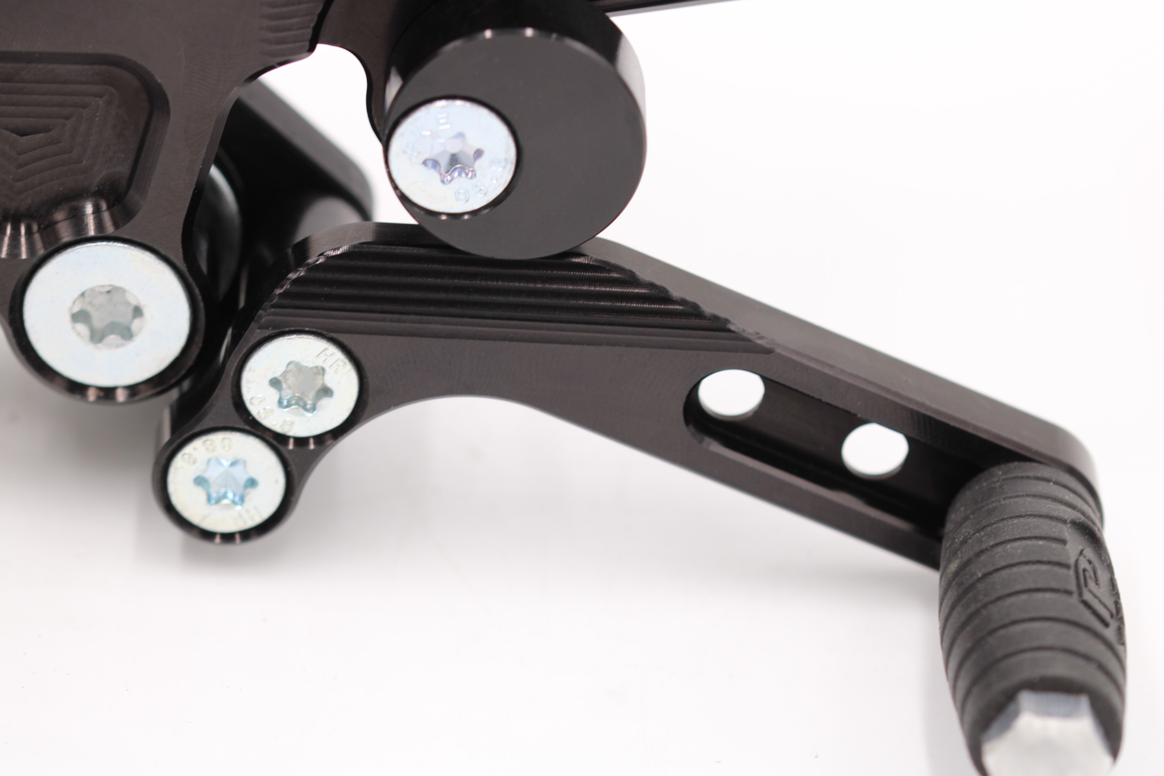 Set podporuje standardní i reverse (GP) shifting a je plně kompatibilní s brzdovým světlem. Celá sestava je CNC obráběná z vysoce pevného hliníku 7075-T6, s tvrdým eloxem, precizním závodním zpracováním a speciálním odlehčením optimalizovaným pomocí ANSYS. Frézované kapsy na zadní straně ramene snižují hmotnost a současně výrazně zvyšují pevnost celé sestavy. Stupačky se speciálním profilem testovaným ve vytrvalostních závodech EWC / 24h Le Mans zajišťují extrémní grip i za mokra. PURE CONCEPT tak pro Panigale V4 rodinu představuje technicky propracované řešení pro jezdce, kteří chtějí ergonomii bez kompromisů a špičkové dílenské zpracování.