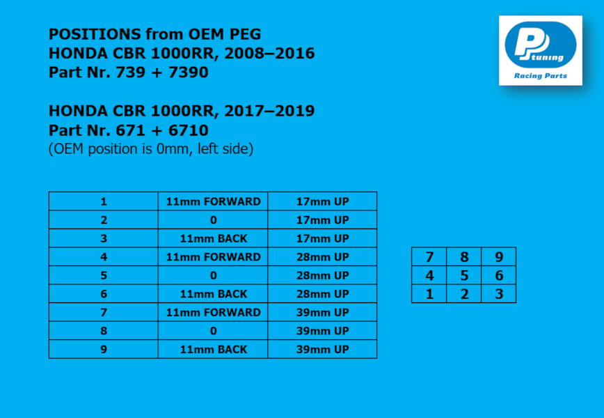 Stupačkový set PP Tuning RACE CONCEPT pro Honda CBR 1000RR (2008–2016) je navržen pro litrový supersport s důrazem na stabilitu, jistotu při brzdění a přesnou kontrolu v náklonu. Konstrukce podporuje pevnou oporu nohou a čitelnou odezvu motocyklu při sportovní silniční jízdě.