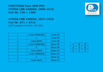 Set je určen pro standardní (OEM) řazení a zachovává logiku sériového ovládání Fireblade. Oproti originálním stupačkám přináší sportovnější ergonomii, lepší cit v ovládacích pákách a možnost doladění posedu bez negativního vlivu na tuhost celé sestavy.