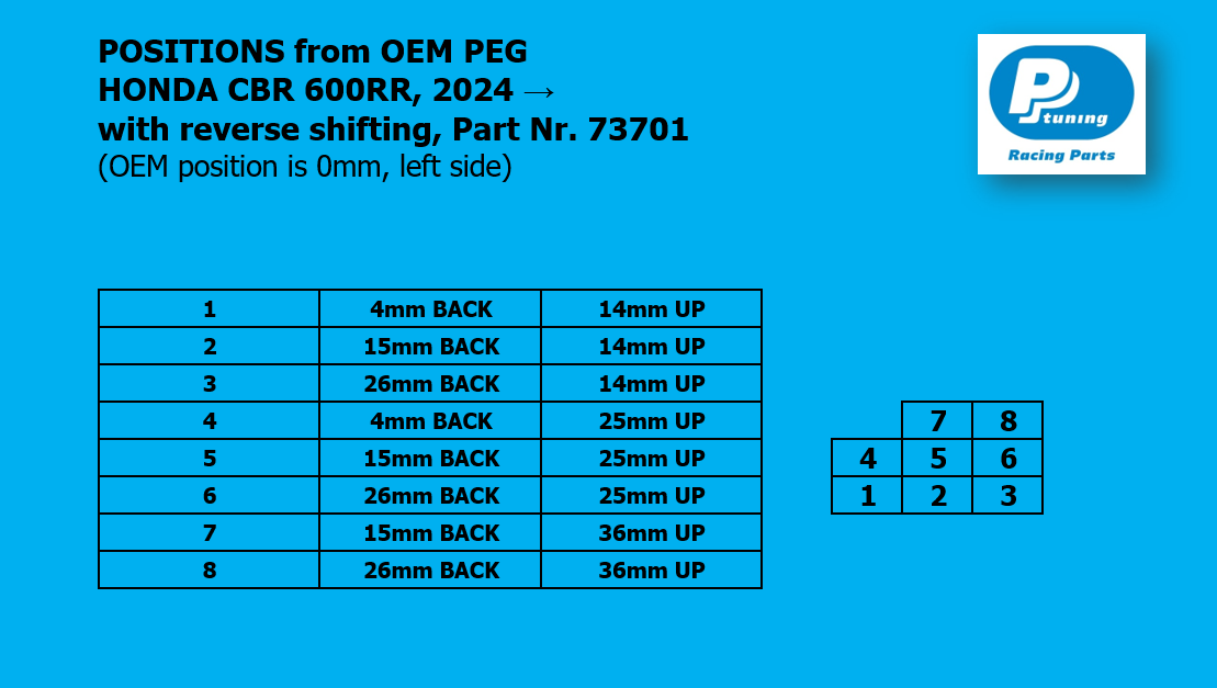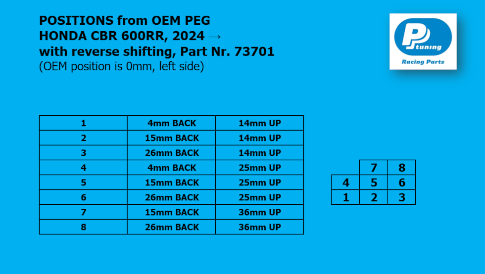 Oproti sériovým stupačkám přináší tento stupačkový set výrazně širší možnosti nastavení a sportovně orientovanou ergonomii. Celý systém je optimalizován výhradně pro reversní (obrácené / GP) řazení, které je standardem v závodním prostředí a umožňuje rychlejší a přesnější řazení při náklonech.
