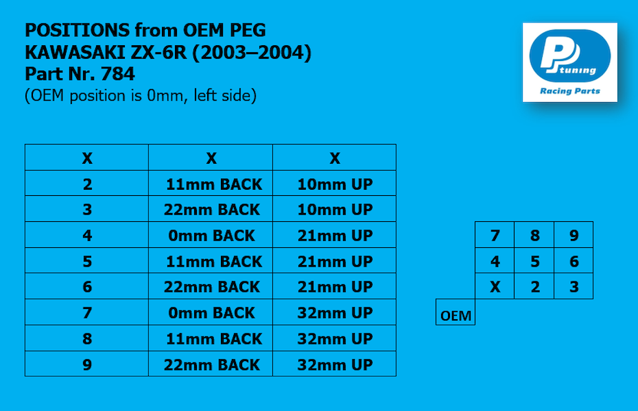 Stupačkový set PP Tuning RACE CONCEPT pro Kawasaki ZX-6R (2003–2004) byl navržen pro generaci lehkých supersportů, kde hraje hlavní roli cit v ovládání a stabilní opora nohou při rychlé změně směru. Konstrukce podporuje přirozený posed a jasnou odezvu motocyklu při sportovní jízdě.