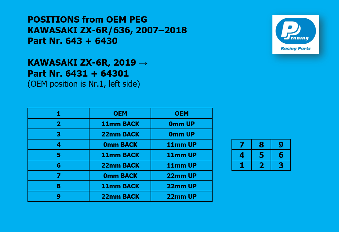 Stupačkový set pro Kawasaki ZX-6R / ZX636 (2007–2018) je navržen pro supersport, který se pohybuje na hraně přilnavosti. Konstrukce vytváří pevný referenční bod pro práci tělem při brzdění na limitu i při agresivním výjezdu ze zatáčky.
