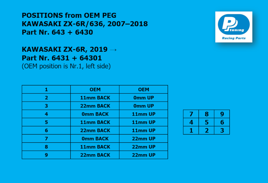 Stupačkový set PP Tuning RACE CONCEPT pro Kawasaki ZX-6R / ZX636 (2019–) je navržen pro moderní generaci supersportu, kde se klade důraz na přesnost ovládání, stabilitu při brzdění a čitelnost chování v náklonu. Konstrukce podporuje pevnou oporu nohou a přirozený posed při svižné silniční i sportovní jízdě.