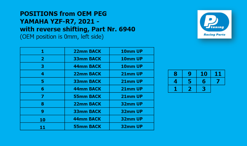 Stupačkový set PP Tuning RACE CONCEPT pro Yamaha YZF-R7 (2021–) v provedení pro reversní řazení je určený pro jezdce, kteří chtějí motorku posunout blíž k trackday nebo okruhovému použití. U R7 má GP řazení velký smysl hlavně tam, kde jezdec pracuje s vyšší rychlostí v nájezdu, častěji řadí v náklonu a chce mít motorku připravenou na sportovní použití bez kompromisů v ovládání.